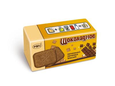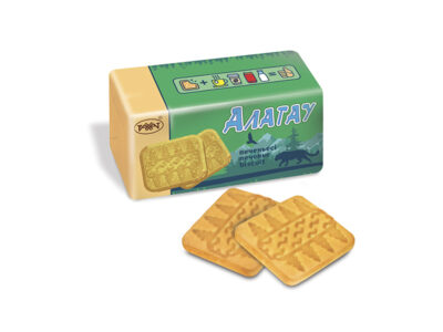 Ingredients: fortified wheat flour, vegetable fat (palm oil), sugar, corn starch, glucose syrup, common salt, aerating agents: baking soda, ammonium carbonate; egg powder, emulsifier – soy lecithin; dairy butter, enzyme (protease), aromatizers are identical to natural.