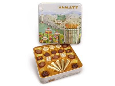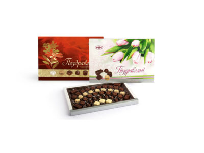 Коррекске орналастырылған, қорапқа 2 қабаттан салынған сонылы рецептурадағы кәмпиттер жиынтығы: «Орех» – Бүтіндей қуырылған бадам жаңғағы қосылған ақ шоколад салмалы, коньяк пен ванильдің дәмі бар сүт шоколадтан жасалған кәмпит; «Сердечки»(қара)- «Капучино» кофесінің дәмі бар шоколад салмалы шоколадтан жасалған кәмпит; «Сердечки»(ақ)- Ақ глазурден жасалған кәмпит. Салмасы шие және қоюландырылған сүт дәмі бар крем; «Ежики»-Ванильдің дәмі бар ұсатылған бадам және кешью жаңғағынан жасалған шоколад кәмпиті; «Орнамент»- Какао бұршақтарының жармасы мен коньяк қосылған шоколад салмасы бар ащы шоколадтан жасалған; «Полено ореховое»- Апельсиннің дәмі бар вафли үгіндісі мен ұсатылған жаңғақ қосылған пралинеден жасалған кәмпит. Қос қабат глазурдің ортасында ұсатылған жаңғақ қабаты бар кәмпит; «Корона»- Ванильдің дәмі бар,коньяк қосылған, екі қабатты ашық және қоңыр трюфель салмасы бар шоколадтан жасалған.